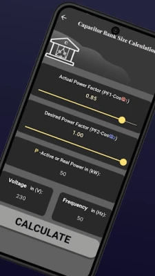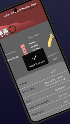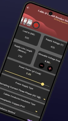 -The app offers step-by-step guidance for engineering calculations, providing results for cable, breaker, earthing, PFC, and trunk size.