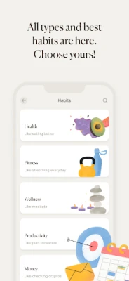 Habits Ideas: Discover new habits to track, meticulously organized for you based on 10 key life categories––perfect to help you get started.
