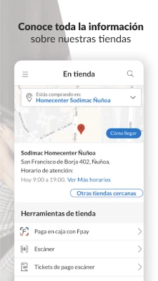 Obtén información detallada sobre la ubicación de cada tienda, horarios de apertura, eventos especiales y promociones exclusivas. Ya sea que estés buscando la tienda más cercana o quieras descubrir nuevas ubicaciones en Argentina, Brasil, Chile, México y Perú, el App Sodimac te proporcionará la información que necesitas. La función de escaneo de productos revoluciona tu experiencia de compra. Simplemente utiliza la cámara de tu dispositivo para escanear los códigos de barras de los productos en la tiendas Homecenter y obtén información detallada al instante. Esta característica no solo te brinda descripciones detalladas, sino que también te permite agregar artículos a tu carrito de compras de manera rápida y fácil. Olvídate de las largas colas en la caja; con nuestra aplicación, puedes realizar pagos directamente desde tu teléfono. ¿Eres un Maestro o profesional de la construcción? Nuestra aplicación te facilita la estimación eficiente de proyectos de pisos y pinturas. Simplemente ingresa las dimensiones de tu espacio y selecciona entre nuestra amplia gama de opciones y se generará automáticamente una estimación detallada, incluyendo los materiales necesarios y los costos asociados. Ahorra tiempo y esfuerzo al planificar y cotizar tus proyectos de renovación. Si estás renovando tu casa, aquí encuentras todo en muebles, electrohogar, baños y cocinas, pisos, aire libre, jardín, iluminación, decoración, herramientas y ferretería.